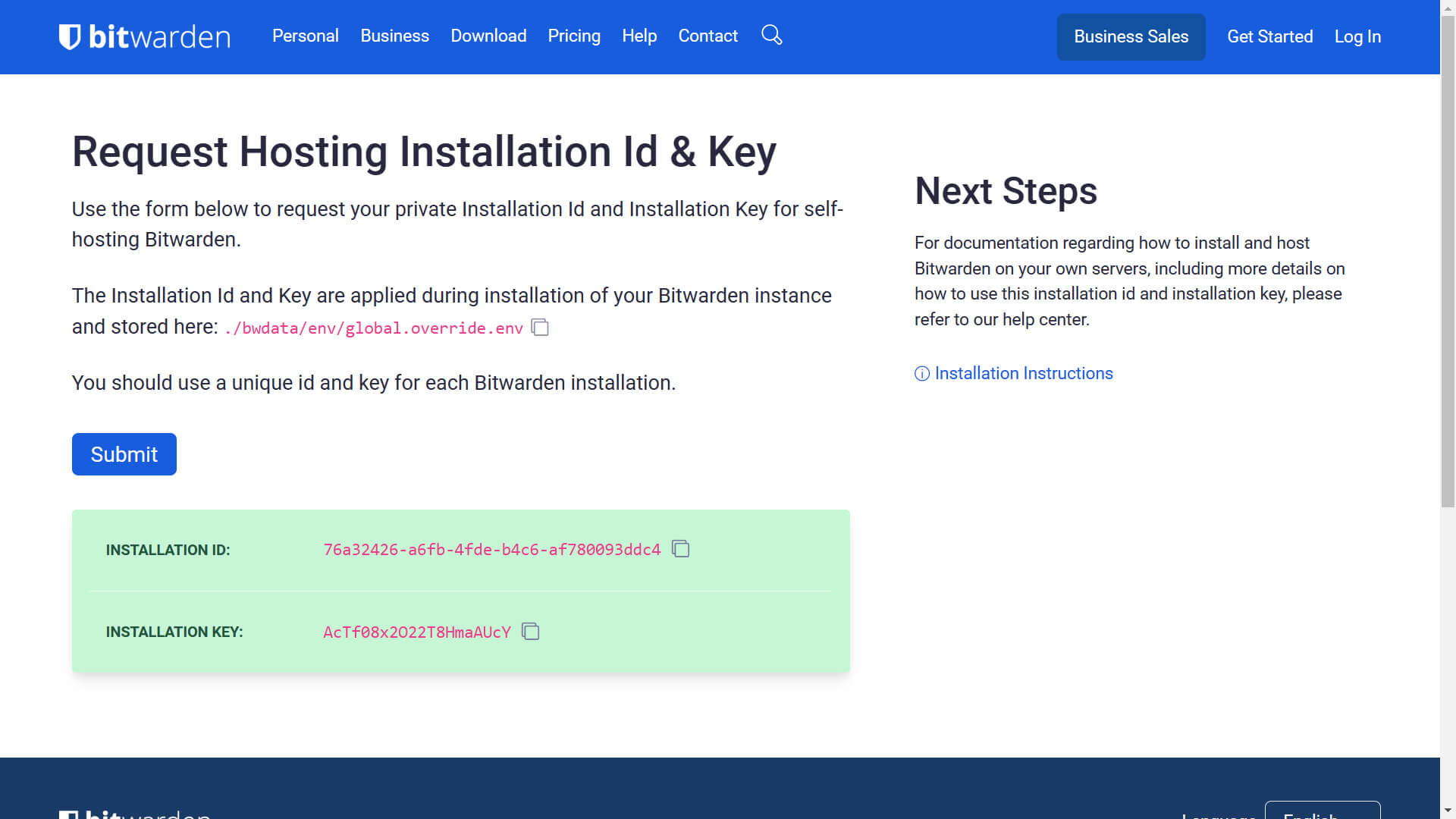 vault.waddledee.com。 - 访问 https://bitwarden.com/host,申请自托管 Bitwarden 所需的安装 ID 和 Key:
